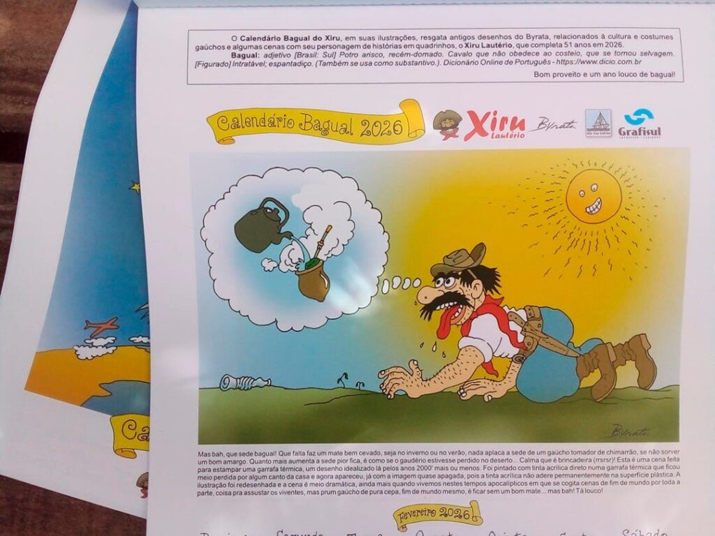 De Santa Maria, a “Cidade coração do Rio Grande”,  o cartunista Jorge Ubiratã da Silva Lopes, popularmente conhecido como cartunista Byrata, “pai” do icônico personagem Xirú Lautério – que comemora 51 anos em 2026, comenta sobre a nova edição do Calendário Bagual do Xiru Lautério 2026: um baita presente!!!