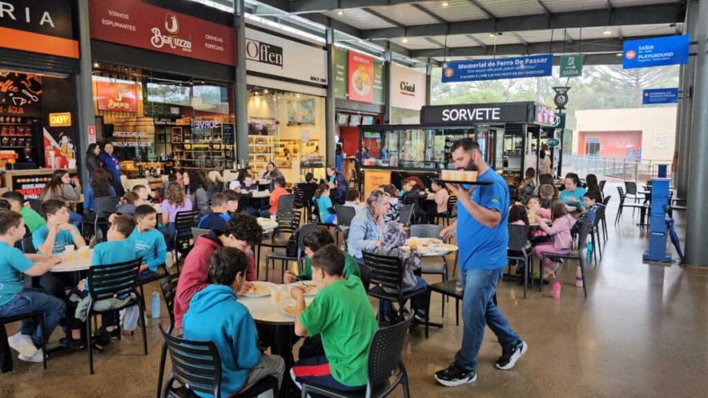Após o passeio na primeira plataforma de vidro da América Latina, as crianças almoçaram na Gramado Massas (FOTO), que é uma das operações de alimentação do parque, e ganharam balões e chocolates Prawer.